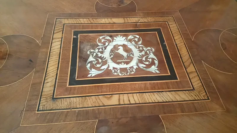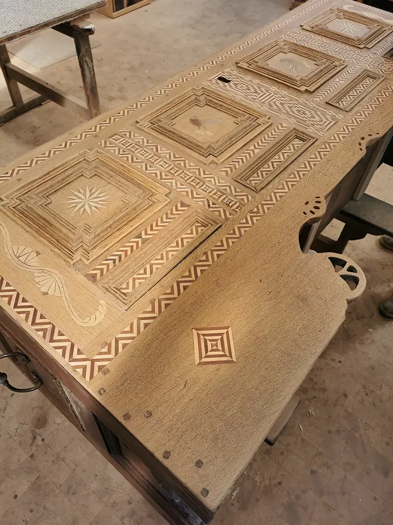 Detailansicht eines kunstvoll gearbeiteten Schreibtisches mit Schubladen, Intarsien und architektonischen Elementen im klassischen Stil